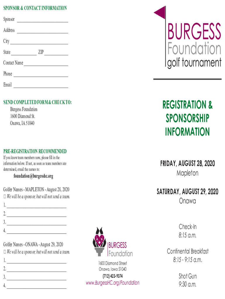 SPONSOR & CONTACT INFORMATION Sponsor ___ Address ___ City ___ State ___ ZIP ___ Contact Name ___ Phone ___ Email ___REGISTRATION & SPONSORSHIP INFORMATIONSEND COMPLETED FORM & CHECK TO: Burgess Foundation