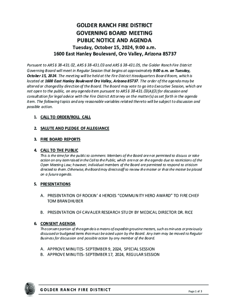GOLDER RANCH FIRE DISTRICT GOVERNING BOARD MEETING PUBLIC NOTICE AND AGENDATuesday, October 15, 2024, 9:00 a.m. 1600 East Hanley Boulevard, Oro Valley, Arizona 85737 Pursuant to ARS 38431.02, ARS