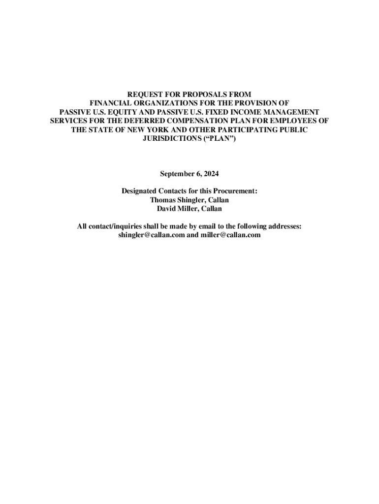 REQUEST FOR PROPOSALS FROM FINANCIAL ORGANIZATIONS FOR THE PROVISION OF PASSIVE U.S. EQUITY AND PASSIVE U.S. FIXED INCOME MANAGEMENT SERVICES FOR THE DEFERRED COMPENSATION PLAN FOR EMPLOYEES OF THE