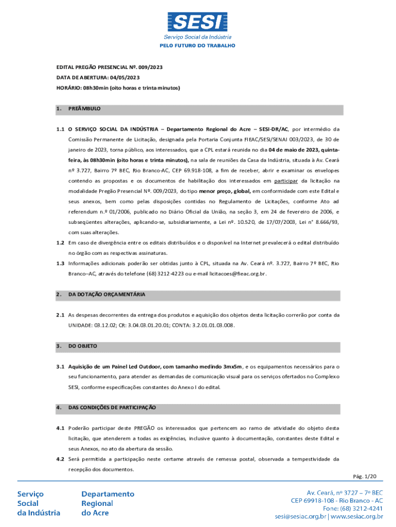 EDITAL PREGO PRESENCIAL N. 009/2023 DATA DE ABERTURA: 04/05/2023 HORRIO: 08h30min (oito horas e trinta minutos)1.PREMBULO1.1 O SERVIO SOCIAL DA INDSTRIA Departamento Regional do Acre SESIDR/AC, por