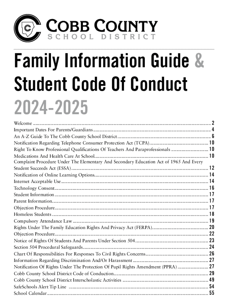 This document serves as a comprehensive guide for families in the Cobb County School District, outlining the important information, policies, rights, and responsibilities of students and parents. It includes the Student Code of Conduct, important dates, complaint procedures, online learning options, and various student services.