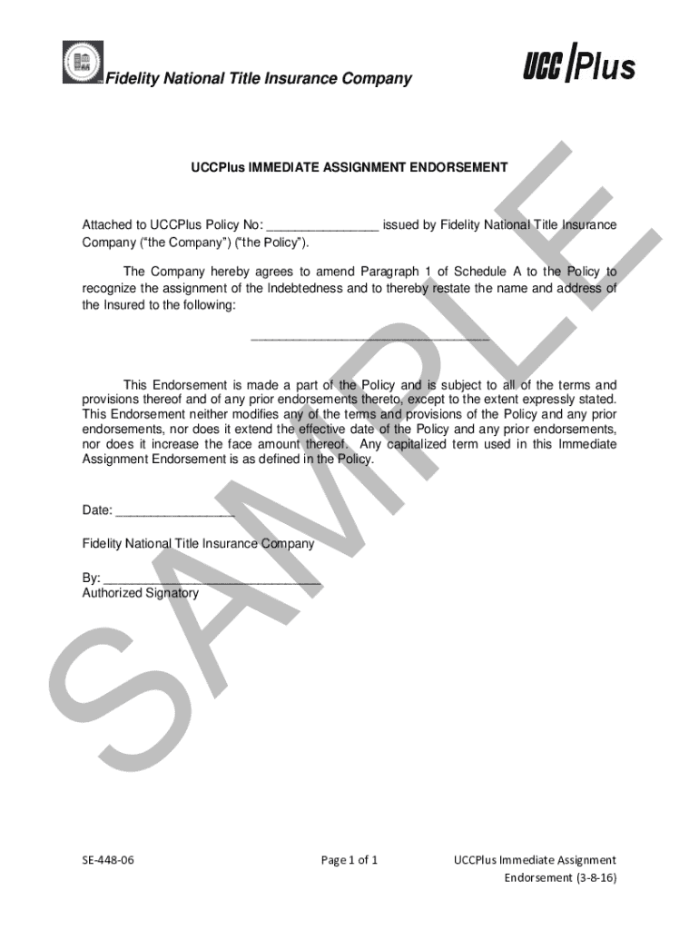 lFidelity National Title Insurance CompanyUCCPlus IMMEDIATE ASSIGNMENT ENDORSEMENTEAttached to UCCPlus Policy No: ___ issued by Fidelity National Title Insurance Company (the Company) (the Policy).PLThe