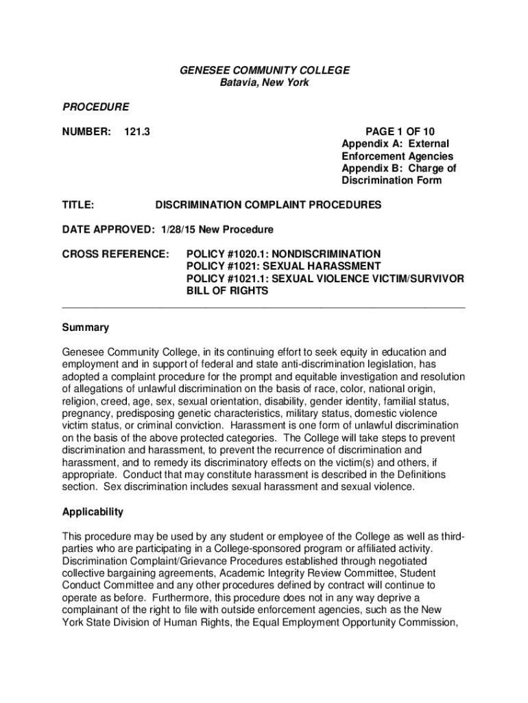 GENESEE COMMUNITY COLLEGE Batavia, New York PROCEDURE NUMBER:TITLE:121.3PAGE 1 OF 10 Appendix A: External Enforcement Agencies Appendix B: Charge of Discrimination Form DISCRIMINATION COMPLAINT PROCEDURESDATE