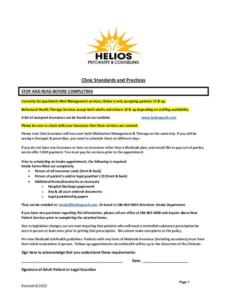 Clinic Standards and Practices STOP AND READ BEFORE COMPLETING Currently for psychiatric Med Management services, Helios is only accepting patients 15 & up. Behavioral Health Therapy Services accept