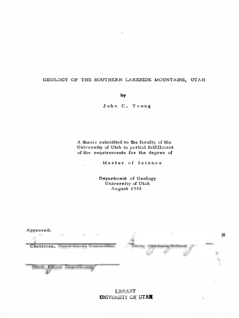 GEOLOGY OF THE SOUTHERN LAKESIDE MOUNTAINS,by JohnYoungC.A thesis submitted to the faculty of the University of Utah in parti3.1 fulfillment of the requirements for the degree of MasterofScie nceDepartment of Geology University of Utah August 1953Approved:Chairman, SupervisoryCommittee/LIBHARY UNIVERSITY O :urUTAHTABLEOFCONTENTS PPage a g e. . . .. . .,I INTRODUCTION INTRODUCTION FFIELD IELD W ORK A ND A CKNOWLEDGEMENTS WORK AND ACKNOWLEDGEMENTS SSTRATIGRAPHY T