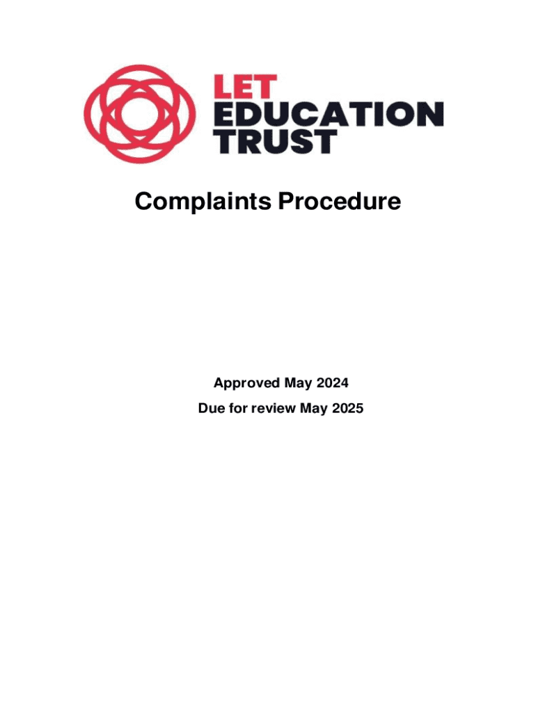 Complaints ProcedureApproved May 2024 Due for review May 2025Who can make a complaint? This complaints procedure is not limited to parents or carers of children that are registered at the school.