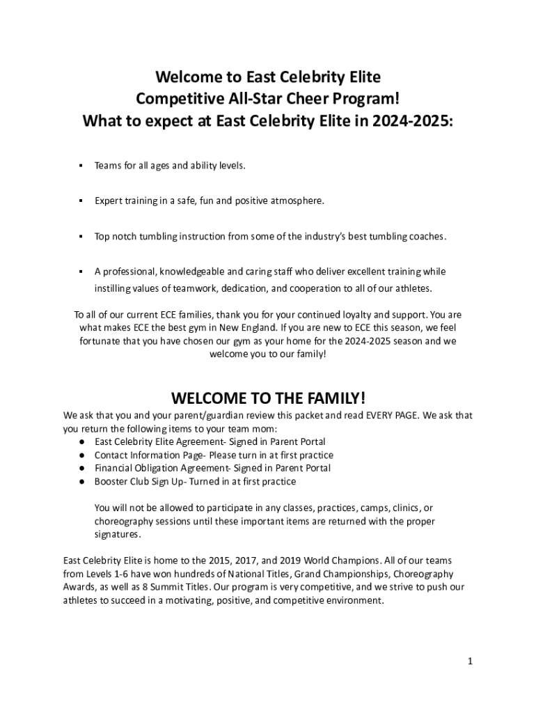 Welcome to East Celebrity Elite Competitive AllStar Cheer Program! What to expect at East Celebrity Elite in 20242025: Teams for all ages and ability levels.Expert training in a safe, fun and positive
