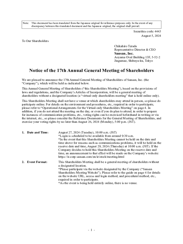This document serves as a notice for the 17th Annual General Meeting of Shareholders for Sansan, Inc., detailing the meeting\'s agenda, format, voting procedures, and company performance over the past fiscal year.