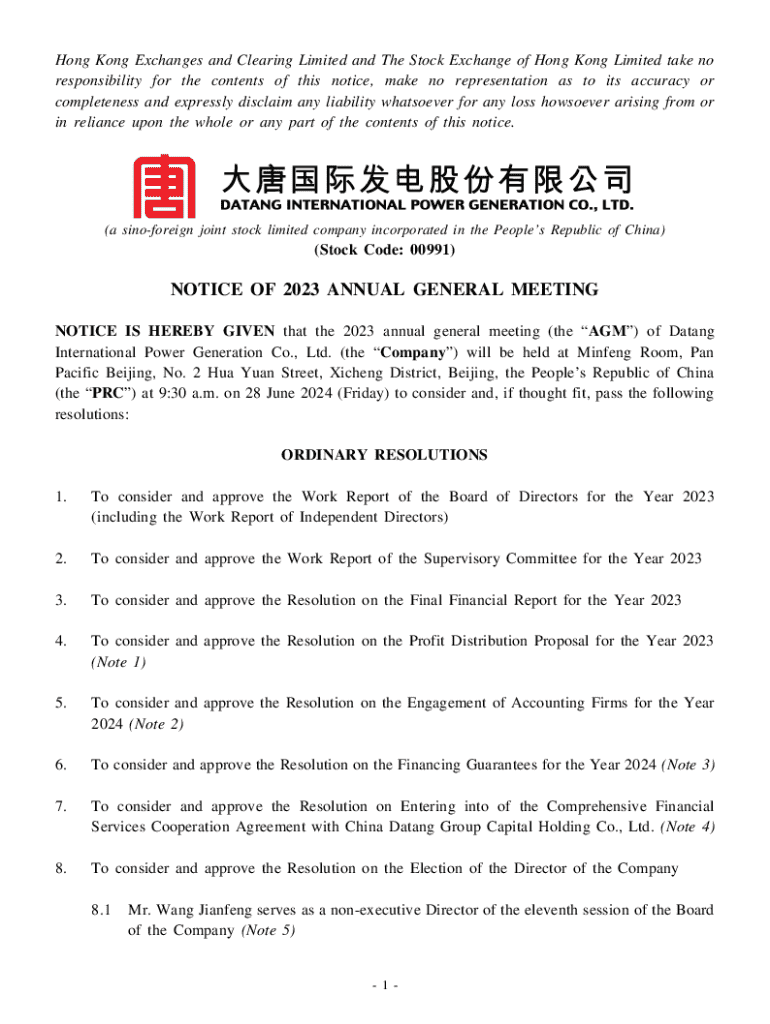 This document contains the notice for the annual general meeting (AGM) of Datang International Power Generation Co., Ltd. scheduled for June 28, 2024. It outlines the agenda, including resolutions for the approval of directors\' work reports, financial statements, profit distribution proposals, and the election of directors. It also details the closure of the register of members and guidelines for H shareholders regarding attendance and voting at the AGM.