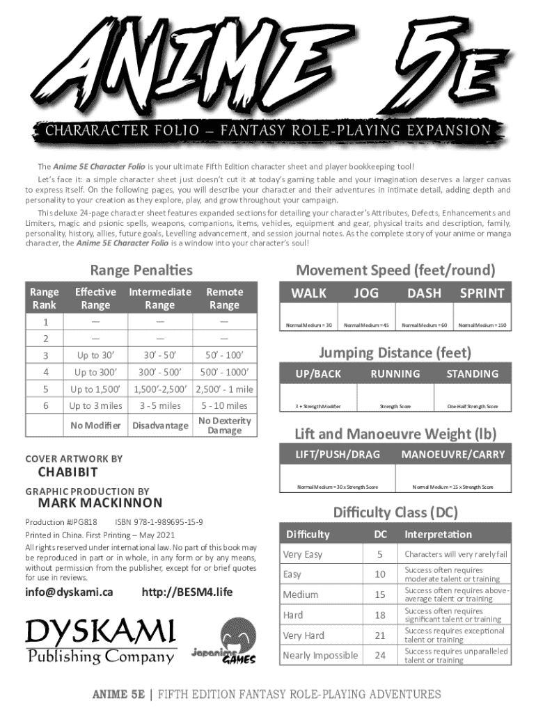 Players who create characters for use in anime 5e games are required to fill out and maintain an anime 5e character folio.