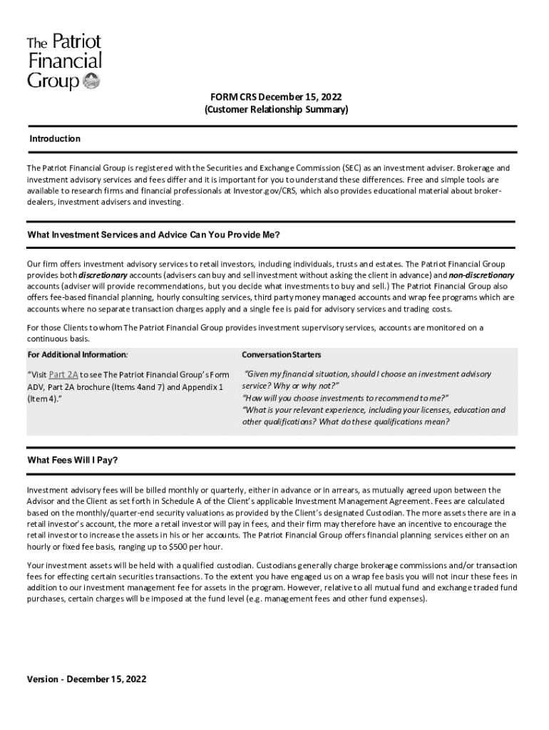 This document provides a summary of the investment advisory services offered by The Patriot Financial Group, including the differences between discretionary and non-discretionary accounts, fee structures, and the legal obligations of the firm as an investment adviser. It details fees and costs associated with services and outlines potential conflicts of interest, while encouraging clients to ask questions about their investments and advisers.