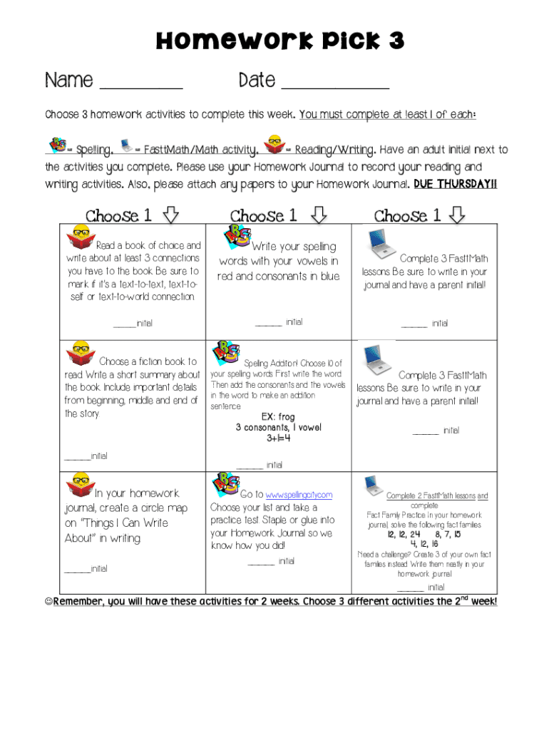 This document outlines a homework assignment where students must choose and complete three activities from specified categories including spelling, math, and reading/writing. It contains instructions that require parental initials for completed tasks and encourages the use of a homework journal for recording progress.