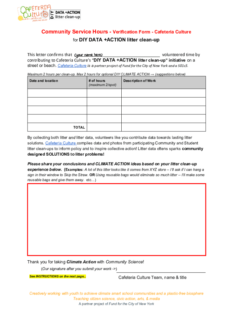 This verification form confirms the volunteer hours contributed to the Cafeteria Culture’s DIY DATA + ACTION litter clean-up initiative, allowing participants to track their service and engage in climate action efforts. It provides space for documenting hours, location, and personal reflections on the clean-up experience.