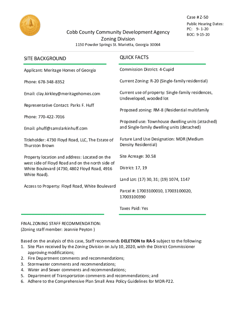 Case # Z50Cobb County Community Development Agency Zoning DivisionPublic Hearing Dates: PC: 9 120 BOC: 915201150 Powder Springs St. Marietta, Georgia 30064SITE BACKGROUNDQUICK FACTSApplicant: Meritage