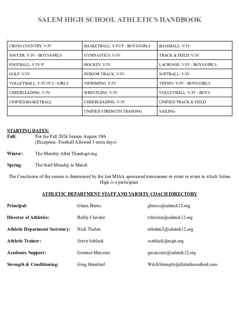 This document outlines the policies, procedures, and expectations for student-athletes at Salem High School, covering various sports, eligibility requirements, conduct expectations, and administrative contacts for the athletics department.