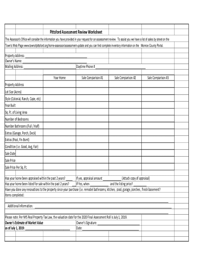 Property owners who believe their property has been inaccurately assessed are required to file the Pittsford Assessment Review Worksheet.