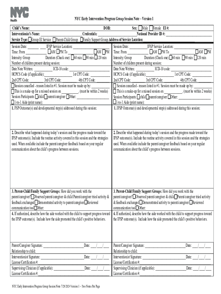 NYC Early Intervention Program Group Session Note Version 1 Childs Name: DOB: Sex: Male Female EI #: Interventionists Name: ___Credentials: ___National Provider ID #: ___ Family Support Group Address