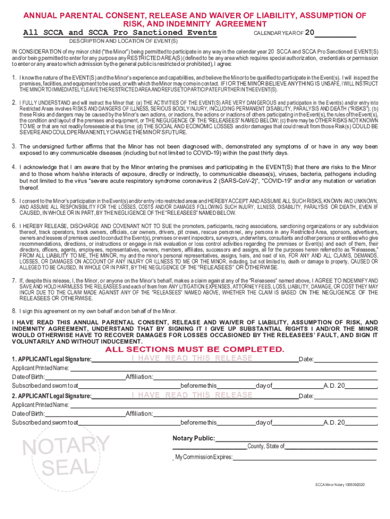 This document serves as a consent form for parents or guardians allowing their minor children to participate in SCCA and SCCA Pro sanctioned events. It outlines the risks involved, including dangers related to participation and potential exposure to communicable diseases. The agreement includes a release of liability, indemnity provisions, and requires a legal signature from the applicant and notary verification.