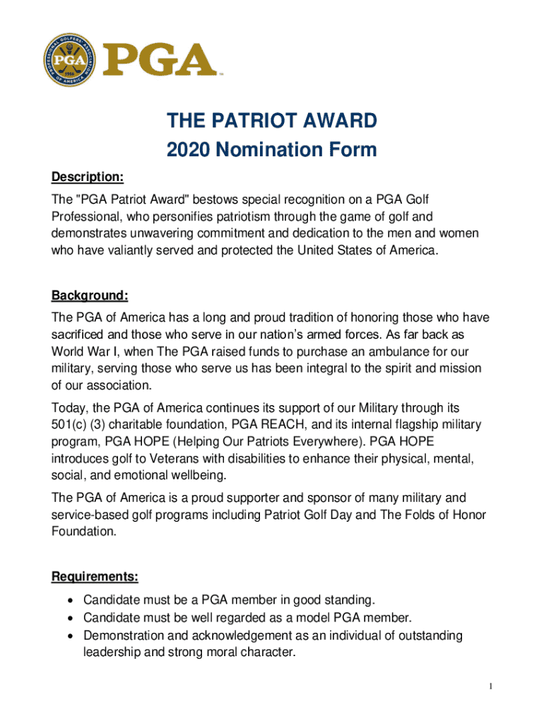THE PATRIOT AWARD 2020 Nomination Form Description: The \"PGA Patriot Award\" bestows special recognition on a PGA Golf Professional, who personifies patriotism through the game of golf and demonstrates