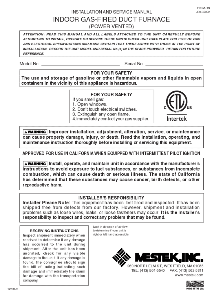 INSTALLATION AND SERVICE MANUALDISM19J3005392INDOOR GASFIRED DUCT FURNACE (POWER VENTED)ATTENTION: READ THIS MANUAL AND ALL LABELS ATTACHED TO THE UNIT CAREFULLY BEFORE ATTEMPTING TO INSTALL, OPERATE