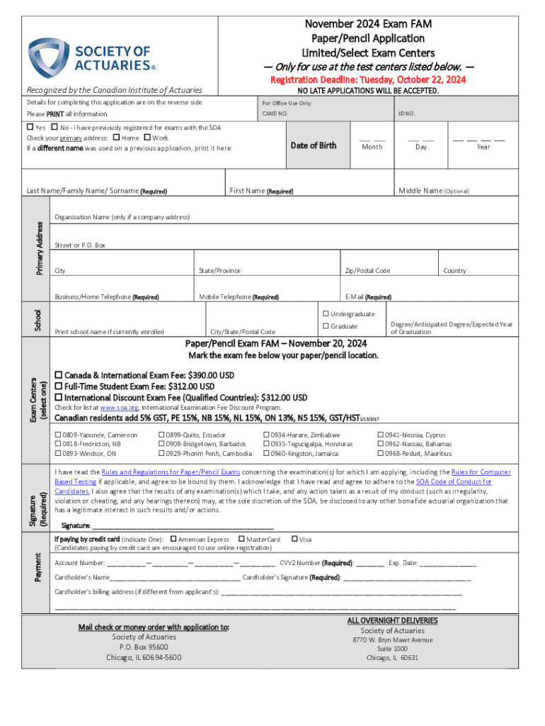 This document serves as the application form for candidates wishing to register for the November 2024 Exam FAM, recognized by the Canadian Institute of Actuaries. It includes details on exam centers, registration deadlines, fees, and application submission guidelines.
