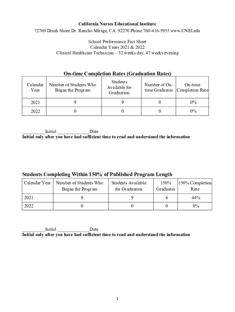 California Nurses Educational Institute 72769 Dinah Shore Dr. Rancho Mirage, CA 92270 Phone 7604165955 www.CNEI.edu School Performance Fact Sheet Calendar Years 2021 & 2022 Clinical Healthcare Technician