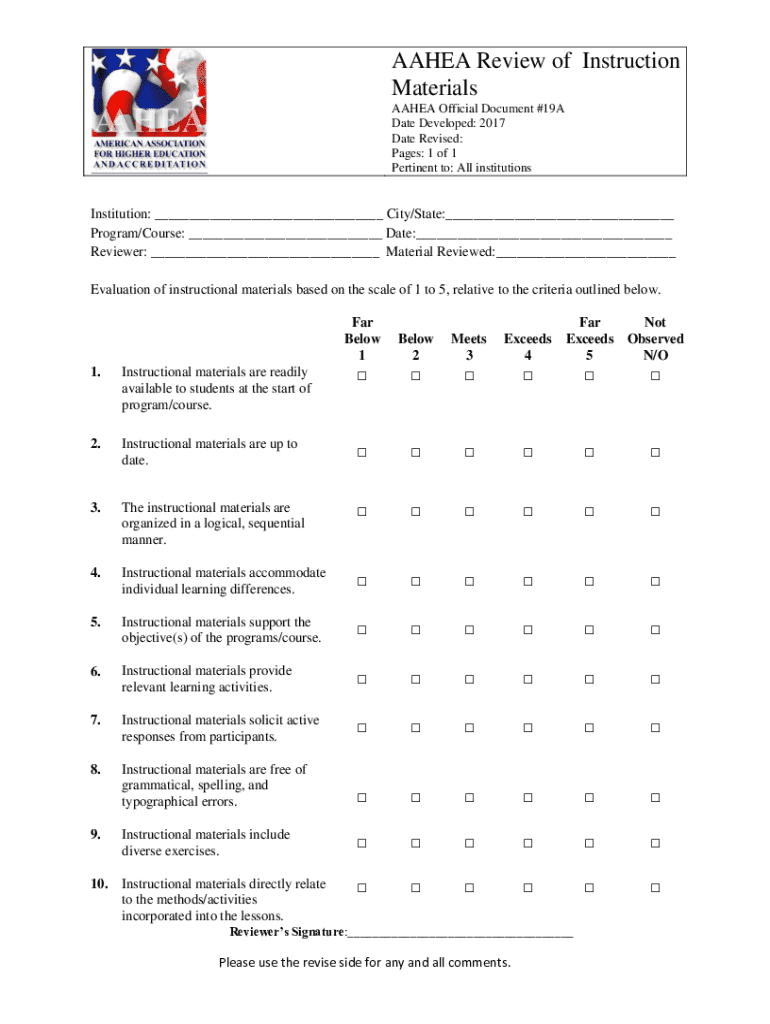 AAHEA Review of Instruction Materials AAHEA Official Document #19A Date Developed: 2017 Date Revised: Pages: 1 of 1 Pertinent to: All institutionsInstitution: ___ City/State:___ Program/Course: ___
