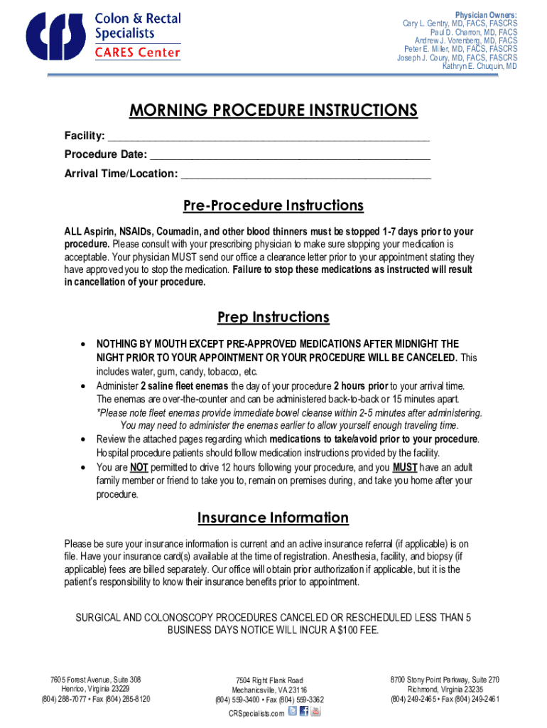 Physician Owners: Cary L. Gentry, MD, FACS, FASCRS Paul D. Charron, MD, FACS Andrew J. Vorenberg, MD, FACS Peter E. Miller, MD, FACS, FASCRS Joseph J. Coury, MD, FACS, FASCRS Kathryn E. Chuquin, MDMORNING