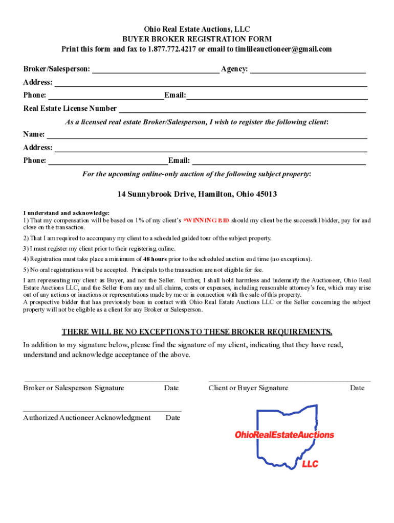 This form is used to register a client for participation in an online-only auction conducted by Ohio Real Estate Auctions, LLC. It outlines the responsibilities and compensation structure for the broker or salesperson, including requirements for accompanying the client and registration deadlines.