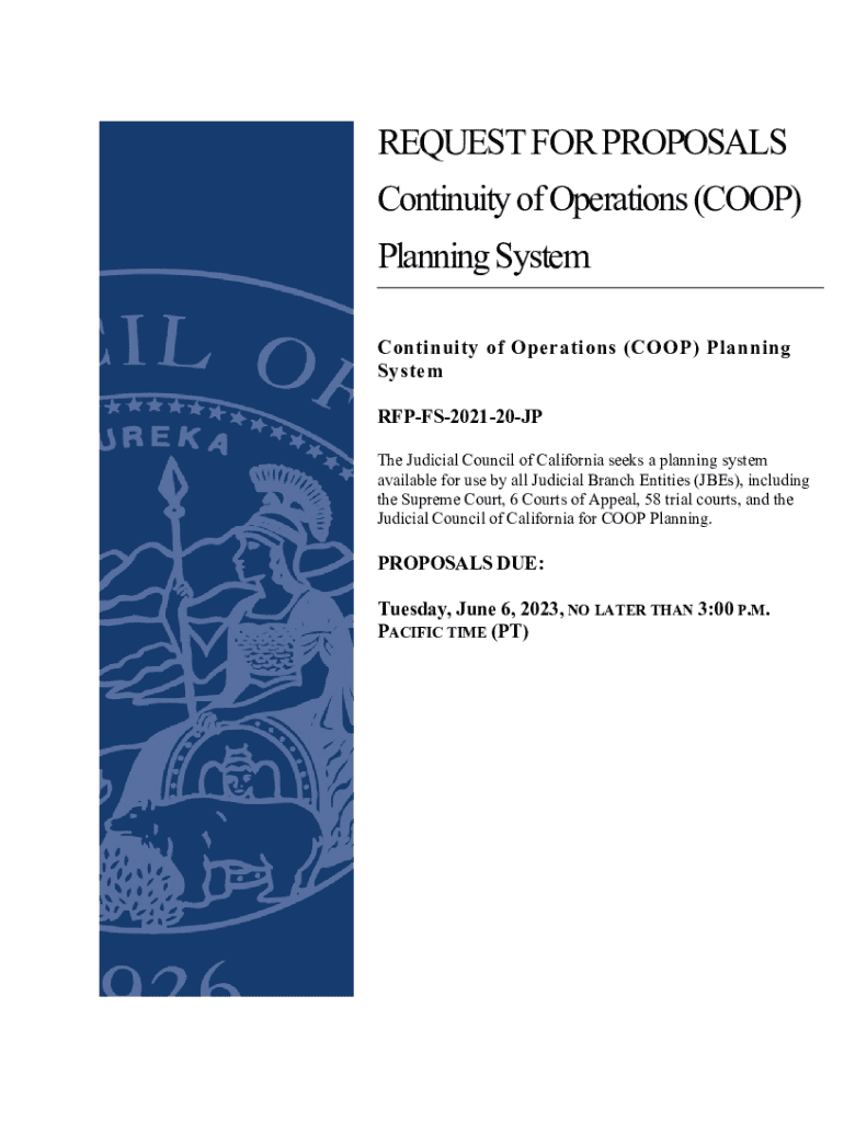 REQUEST FOR PROPOSALS Continuity of Operations (COOP) Planning System Continuity of Operations (COOP) Planning System RFPFS202120JP The Judicial Council of California seeks a planning system available