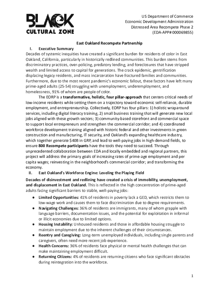 US Department of Commerce Economic Development Administration Distressed Area Recompete Phase 2 (EDAAPP# 000069855) East Oakland Recompete Partnership I. Executive Summary Decades of systemic inequities