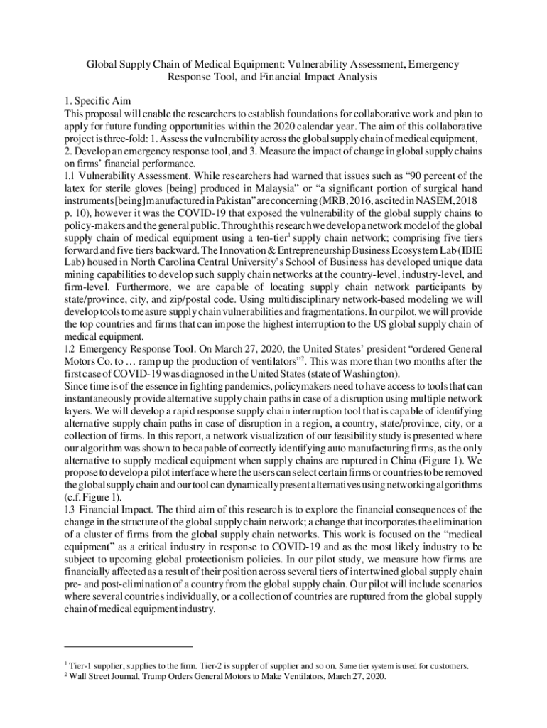 Global Supply Chain of Medical Equipment: Vulnerability Assessment, Emergency Response Tool, and Financial Impact Analysis 1. Specific Aim This proposal will enable the researchers to establish foundations