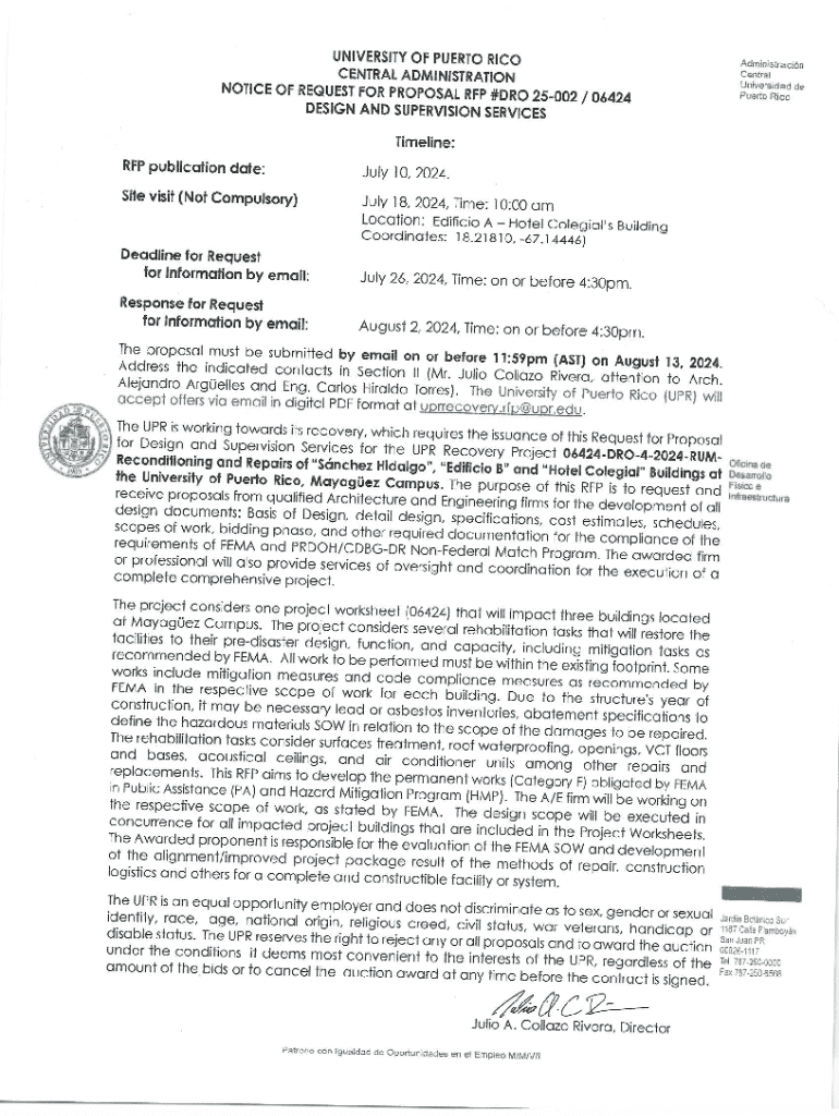REQUEST FOR PROPOSALS FOR: DESING AND SUPERVISION SERVICES FOR Project Number: 06424DRO42024RUM Project Title: RECONDITIONING AND REPAIRS OF SNCHEZ HIDALGO, EDIFICIO B AND HOTEL COLEGIAL BUILDINGS