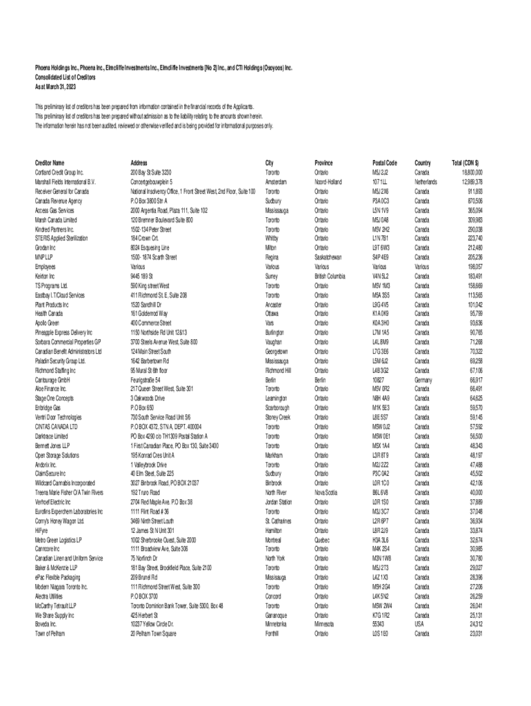 Phoena Holdings Inc., Phoena Inc., Elmcliffe Investments Inc., Elmcliffe Investments [No 2] Inc., and CTI Holdings (Osoyoos) Inc. Consolidated List of Creditors As at March 31, 2023 This preliminary