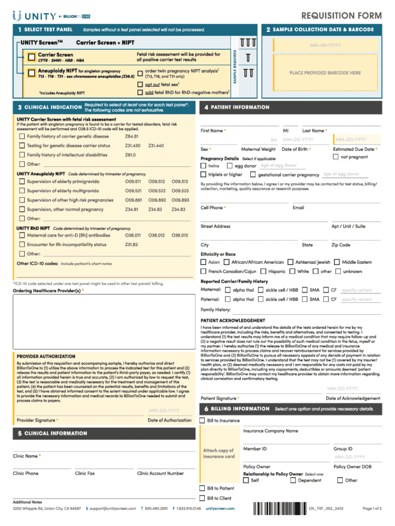1 SELECT TEST PANELSamples without a test panel selected will not be processed.UNITY ScreenTM2 SAMPLE COLLECTION DATE & BARCODECarrier Screen + NIPTCFTR SMN1 HBB HBAAneuploidy NIPT for singleton pregnancyT13