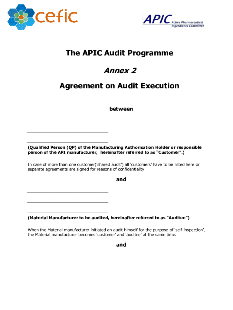 The APIC Audit ProgrammeAnnex 2 Agreement on Audit Execution between(Qualified Person (QP) of the Manufacturing Authorisation Holder or responsible person of the API manufacturer, hereinafter referred