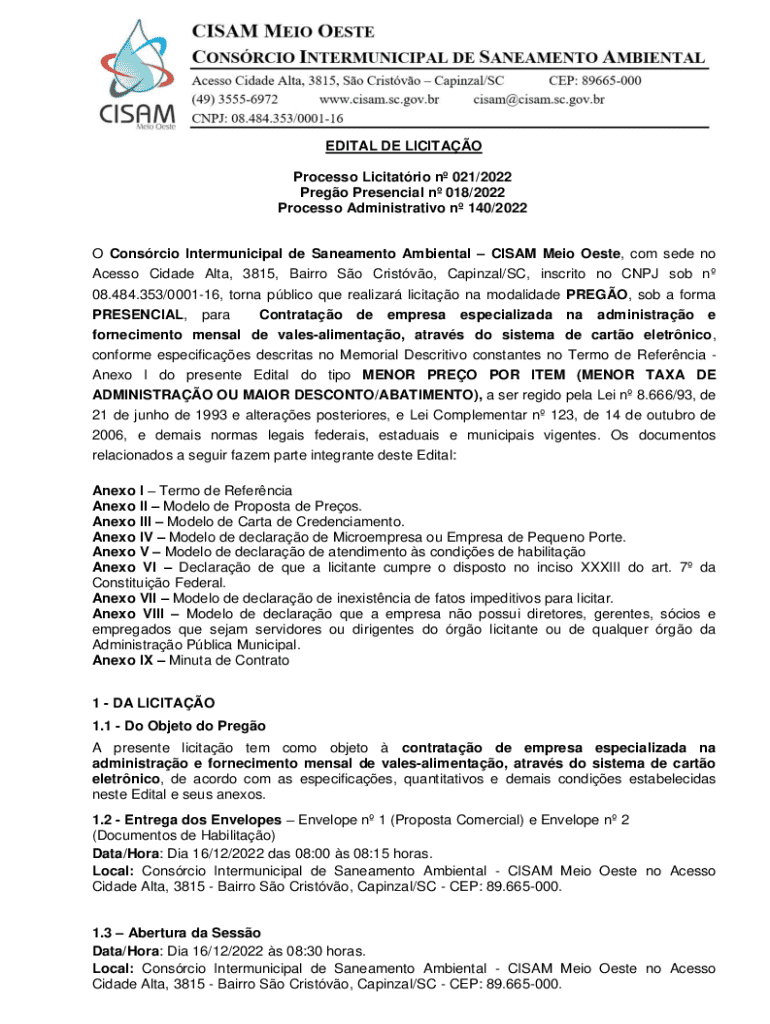 EDITAL DE LICITAO Processo Licitatrio n 021/2022 Prego Presencial n 018/2022 Processo Administrativo n 140/2022 O Consrcio Intermunicipal de Saneamento Ambiental CISAM Meio Oeste, com sede no Acesso