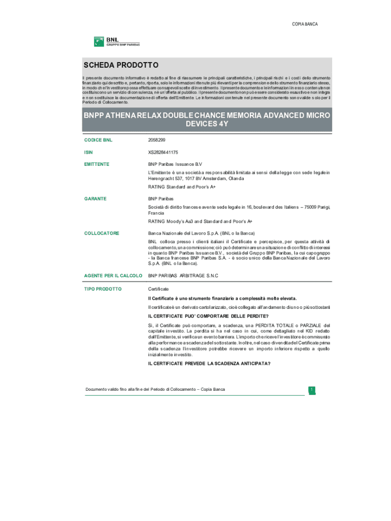 COPIA BANCASCHEDA PRODOTTO Il presente documento informativo redatto al fine di riassumere le principali caratteristiche, i principali rischi e i cost i dello strumento finanziario qui descritto e,