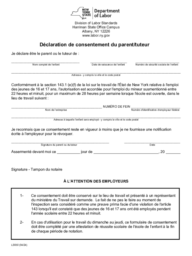 Division of Labor Standards Harriman State Office Campus Albany, NY 12226 www.labor.ny.govDclaration de consentement du parent/tuteur Je dclare tre le parent ou le tuteur de : ___ Nom complet de l\'enfant___