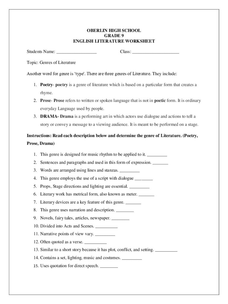 This worksheet for Grade 9 students at Oberlin High School covers the three main genres of literature: Poetry, Prose, and Drama. It includes definitions, characteristics of each genre, and exercises to help students identify the genre based on descriptions. Additionally, it highlights the differences between poetry and prose.