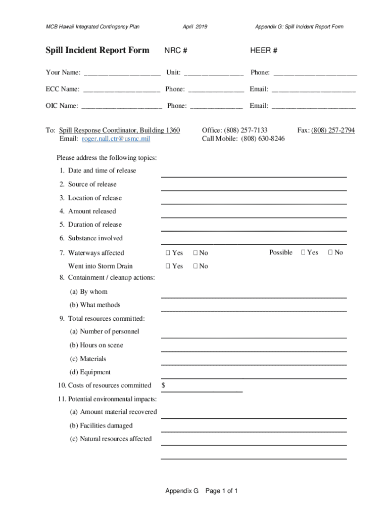 MCB Hawaii Integrated Contingency PlanSpill Incident Report FormApril 2019NRC #Appendix G: Spill Incident Report FormHEER #Your Name: ___ Unit: ___ Phone: ___ ECC Name: ___ Phone: ___ Email: ___ OIC