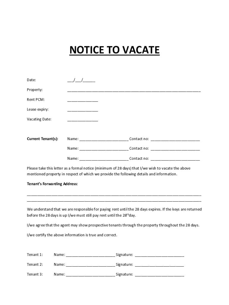 NOTICE TO VACATE Date:___/___/___Property:___Rent PCM:___Lease expiry:___Vacating Date:___Current Tenant(s):Name: ___ Contact no: ___ Name: ___ Contact no: ___ Name: ___ Contact no: ___Please take
