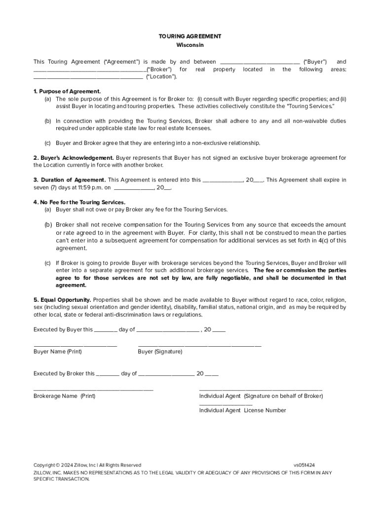TOURING AGREEMENT Wisconsin This Touring Agreement (Agreement) is made by and between ___ (Buyer) and ___(Broker) for real property located in the following areas: ___ (Location). 1. Purpose of Agreement.