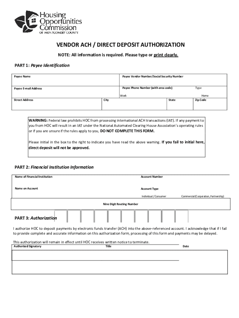This form authorizes the Housing Opportunities Commission (HOC) to deposit payments electronically into a designated financial institution account, providing necessary payee identification and bank information, along with a warning regarding international ACH transactions.