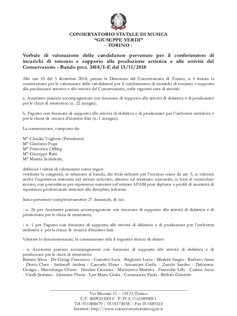 CONSERVATORIO STATALE DI MUSICA GIUSEPPE VERDI TORINO Verbale di valutazione delle candidature pervenute per il conferimento di incarichi di tutorato e supporto alla produzione artistica e alle attivit