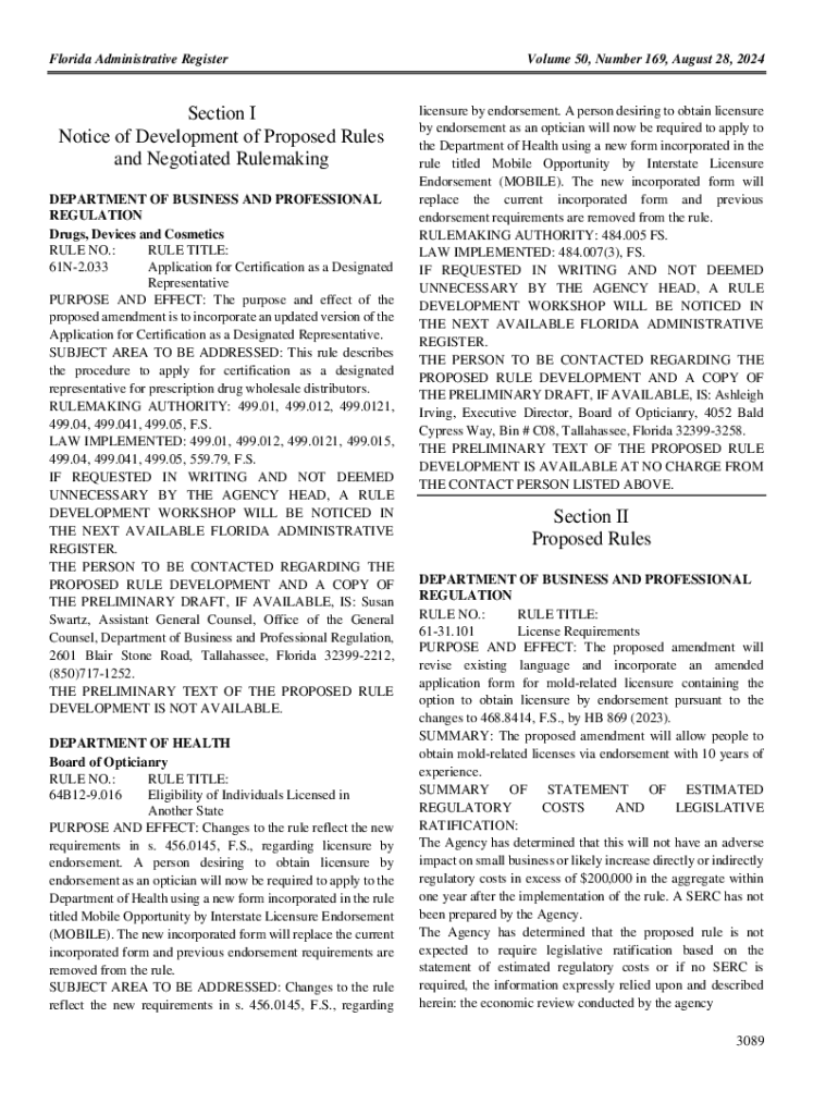 Florida Administrative RegisterSection I Notice of Development of Proposed Rules and Negotiated Rulemaking DEPARTMENT OF BUSINESS AND PROFESSIONAL REGULATION Drugs, Devices and Cosmetics RULE NO.: