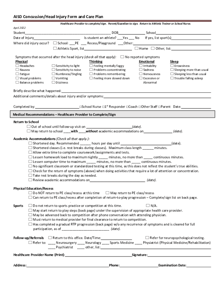 To fill out the AISD Concussion/Head Injury Form, one should gather the necessary information about the incident, including the student’s name, date of the injury, details of the incident, symptoms observed, and any actions taken. After filling out this information, it should be submitted to the appropriate school authority.