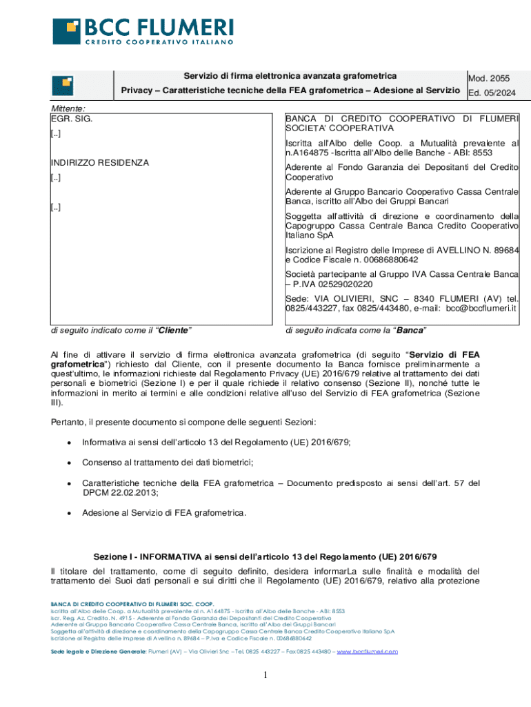 Servizio di firma elettronica avanzata grafometricaMod. 2055 Privacy Caratteristiche tecniche della FEA grafometrica Adesione al Servizio Ed. 05/2024 Mittente: EGR. SIG.BANCA DI CREDITO COOPERATIVO