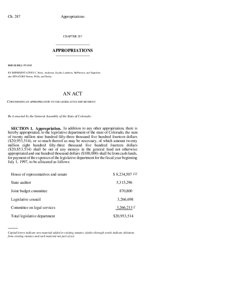 Ch. 287AppropriationsCHAPTER 287___ APPROPRIATIONS ___ HOUSE BILL 971315 BY REPRESENTATIVES C. Berry, Anderson, Snyder, Lamborn, McPherson, and Hagedorn; also SENATORS Norton, Wells, and Feeley.AN