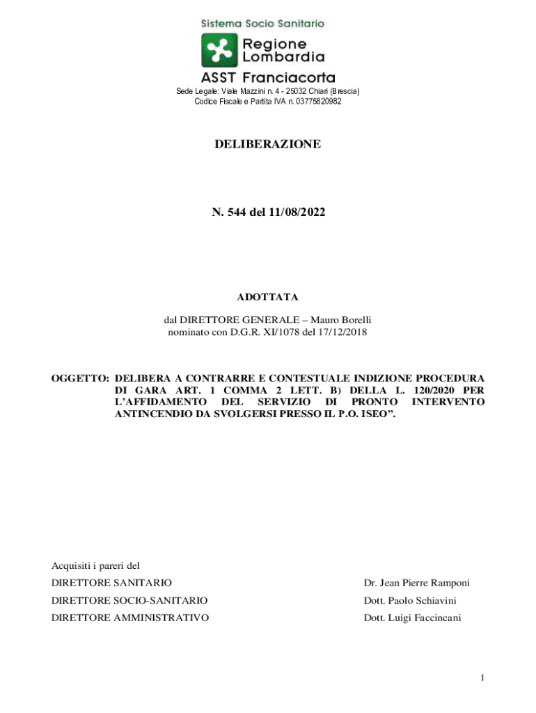 Sede Legale: Viale Mazzini n. 4 25032 Chiari (Brescia) Codice Fiscale e Partita IVA n. 03775820982DELIBERAZIONEN. 544 del 11/08/2022ADOTTATA dal DIRETTORE GENERALE Mauro Borelli nominato con D.G.R.